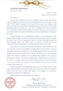 Ngày 29 tháng 9 vừa qua, Hội đồng Giám mục Việt Nam phổ biến Thư của Đức Giáo Hoàng Phanxicô “gửi cộng đoàn Công giáo Việt Nam nhân dịp công nhận Thoả thuận về Qui chế cho Đại diện thường trú của Toà Thánh và Văn phòng Đại diện thường trú của Toà Thánh tại Việt Nam”. Ngày 04 tháng 10 năm 2023, Đức Tổng Giám mục Giuse Nguyễn Năng, Chủ tịch Hội đồng Giám mục Việt Nam đã thay mặt cho Giáo hội tại Việt Nam viết Thư gửi Đức Thánh Cha Phanxicô.