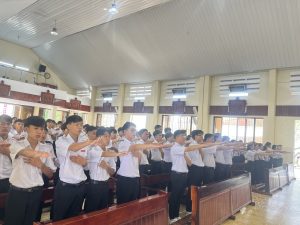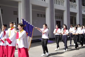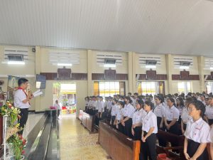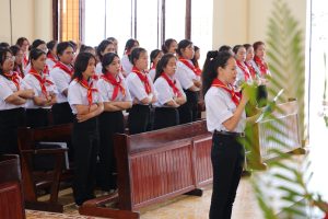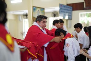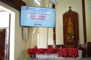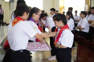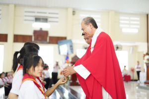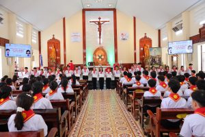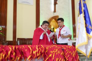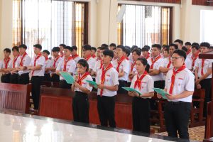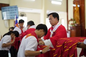 Cha Tuyên úy Philipphe chủ trì nghi thức tuyên hứa với các lời dẫn và thưa: “Thưa nhờ ơn Chúa, chúng con xin hứa…”. Cha Phó Tuyên úy Cha Tôma làm phép khăn và cấp hiệu huynh trưởng Cấp 1,2.