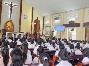 Tiếp theo đó, Cha chia sẻ về câu chuyện tử đạo có thực vào những năm 1861 tại Giáo xứ Ba Giồng. Những lời chia sẻ của Cha thật ấm áp và sinh động, tái hiện lại những giây phút lịch sử sống đạo oanh liệt của những vị anh hùng tử đạo thời đó, đặc biệt là Cha Phêrô Nguyễn Văn Lựu – cũng là bổn mạng Giáo Phận Mỹ Tho – tại vùng đất Ba Giồng thiêng liêng, nay là Trung Tâm Hành hương Các Thánh tử đạo Ba Giồng.