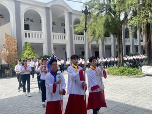 Đúng 9 giờ sáng, các SMS được các anh chị Ban điều hành hướng dẫn vào nhà thờ Giáo xứ Nữ Vương Hòa Bình chuẩn bị hồi tâm, dọn lòng sốt sắng bước vào Thánh Lễ. Cha Tuyên úy Philipphe đã có những giây phút chia sẻ tâm tình dành cho các bạn Huynh trưởng. Sau những phút bình tâm dọn lòng dâng Chúa, Ban Điều Hành giúp các bạn tập các nghi thức trước Thánh Lễ.