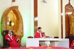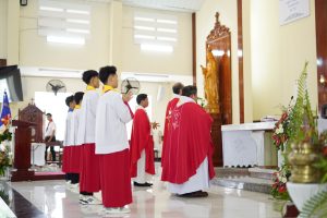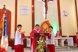 Cha Tổng Đại Diện mở đầu Thánh Lễ với những tâm tình đơn sơ dành cho các SMS, các Huynh trưởng: “Hôm nay là ngày Lễ mừng kính Các Thánh Tử Đạo Việt Nam – cũng là ngày vui của Liên Đoàn TNTT GP. Mỹ Tho, cũng là Bổn Mạng của Giáo Phận Mỹ Tho”. Quý Cha cùng đồng tế dâng Lễ cầu nguyện cho tất cả các bạn Huynh – Dự trưởng, dù là không phải đổ máu như Các Thánh Tử Đạo nhưng tử đạo của một Huynh trưởng Thiếu nhi Thánh thể chính là sự hy sinh trong cuộc sống đời thường hằng ngày của các bạn, đời sống hướng đến tình yêu Chúa Giê su và đến với các em Thiếu Nhi Thánh Thể.