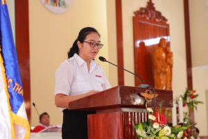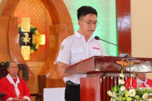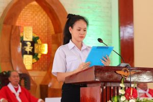 Đại diện các bạn huynh trưởng vừa được tuyên hứa bước lên chia sẻ bài cám ơn đến Đức Cha Phêrô, Cha Tổng Đại diện, Cha Tuyên Úy, Cha Phó Tuyên úy cùng Quý Cha đồng tế, và các anh chị Huynh trưởng ban điều hành, các hội đoàn, và đặc biệt là Ban ẩm thực của Gx Ba Giồng…