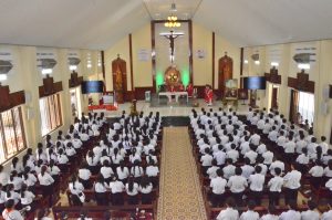 Từ 7 giờ sáng, các SMS từ khắp các xứ cùng tụ họp về Trung Tâm Mục Vụ GP Mỹ Tho. Được sự hướng dẫn từ các anh chị Ban Chấp Hành Liên Đoàn và Ban Điều Hành Sa Mạc, các SMS thực hiện các thủ tục hành chính trước Thánh Lễ.