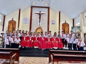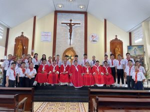 Kết thúc Thánh lễ, các em được chụp hình lưu niệm với Quý Cha và Quý ban điều hành theo từng Giáo xứ. Sau Thánh Lễ là buổi tiệc liên hoan buffet cùng nhau do Cha Gioanbaotixita Nguyễn Tấn Sang – Cha Sở Giáo xứ Ba Giồng tài trợ.