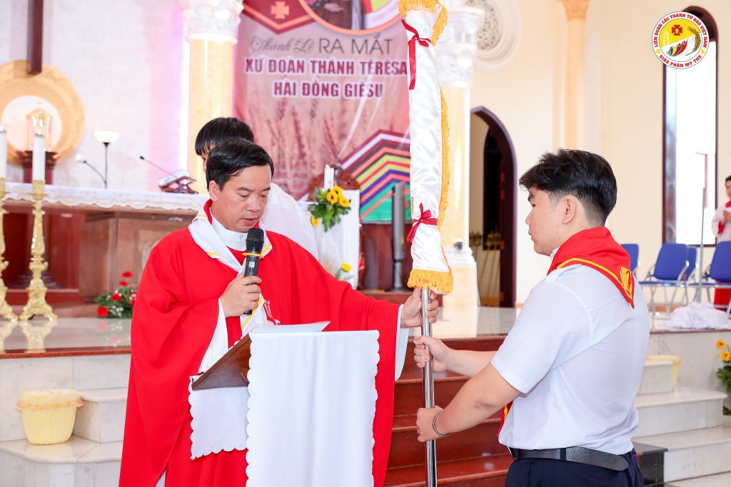 Sau đó, cha Tuyên uý đọc văn thư công nhận xứ đoàn TÊRESA HÀI ĐỒNG GIÊSU, và Liên Đoàn Phó nghiên huấn đọc quyết định công nhận ban điều hành xứ đoàn nhiệm kỳ 2024-2029. Cuối cùng, tiếng hát “ Tuổi trẻ Việt Nam đem Chúa cho giới trẻ mọi nơi” đã cất lên cùng với nghi thức chào cờ diễn ra đầy trang nghiêm.