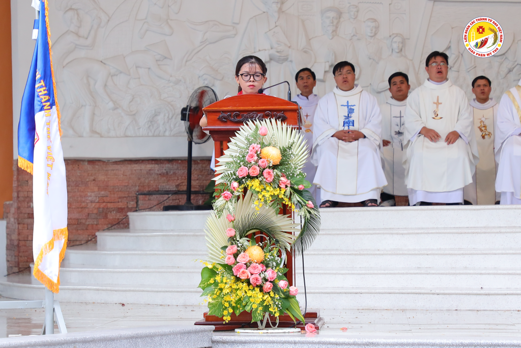 Sau lời nguyện Hiệp Lễ, Trưởng Tôma Lê Thái Sơn đại diện cho các bạn Giới trẻ – Thiếu Nhi Thánh Thể có lời tri ân đến Đức cha, Cha Tổng đại diện và quý cha đã tạo mọi điều kiện để tất cả Giới trẻ – Thiếu Nhi Thánh Thể có một ngày Hành hương thật ý nghĩa.