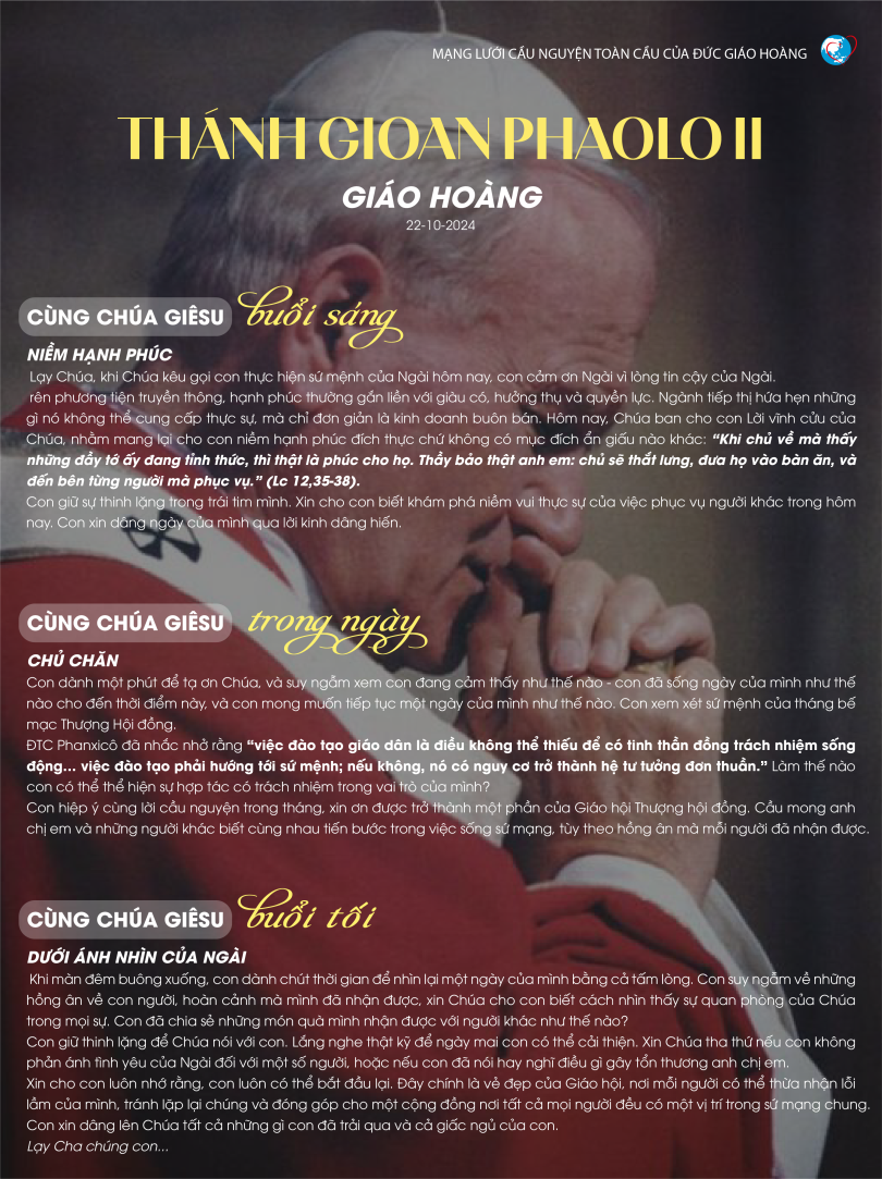 Trên phương tiện truyền thông, hạnh phúc thường gắn liền với giàu có, hưởng thụ và quyền lực. Ngành tiếp thị hứa hẹn những gì nó không thể cung cấp thực sự, mà chỉ đơn giản là kinh doanh buôn bán. Hôm nay, Chúa ban cho con Lời vĩnh cửu của Chúa, nhằm mang lại cho con niềm hạnh phúc đích thực chứ không có mục đích ẩn giấu nào khác: “Khi chủ về mà thấy những đầy tớ ấy đang tỉnh thức, thì thật là phúc cho họ. Thầy bảo thật anh em: chủ sẽ thắt lưng, đưa họ vào bàn ăn, và đến bên từng người mà phục vụ.” (Lc 12,35-38).